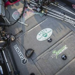 Sometimes, a t-shirt just isn’t enough to display your undying love of Karl’s Bait and Tackle (or Catch Co. in general). Let everyone know what you’re about with our premium decals on your bass boat carpet. The Catch Co. logo measure in at 16″ X 4.48″ and the Karl’s Bait & Tackle logo measures in at 16″ X 10.10″. Scuff and slip resistant, the 3M Armor Coating keeps the graphics looking as fresh as the day they were printed. No matter the foot traffic, these bad boys will not fade. Long-lasting, yet easy to remove. But let’s be real, no one’s taking Karl’s face off their boat.